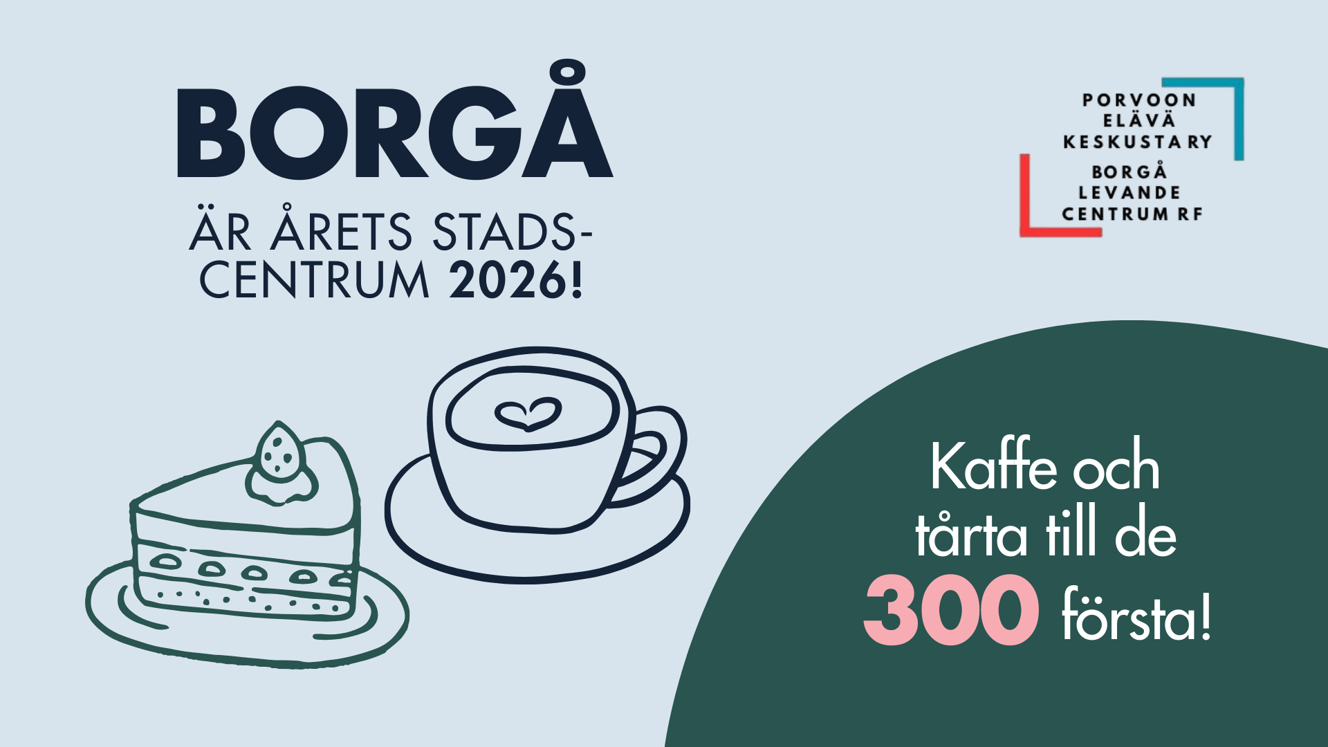 Vi vill bjuda in dig att fira denna framgång tillsammans med oss. Borgå levande centrum rf bjuder de 300 första gästerna på kaffe och tårta lördagen den 14.3 kl. 10–12 på andra våningen i Köpcentrum Lundi.